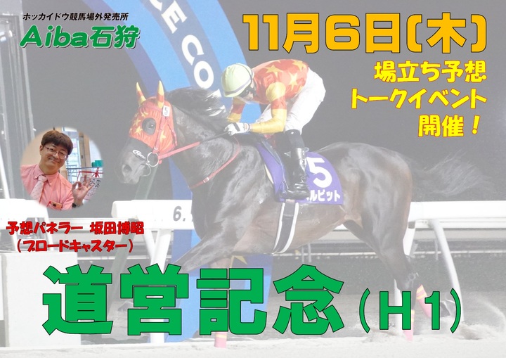 Aiba石狩イベントについて(11月6日)Aiba石狩では、11月6日(木)にブロードキャスター坂田博昭さんによる場立ち予想トークイベントを行いますので、皆さまぜ