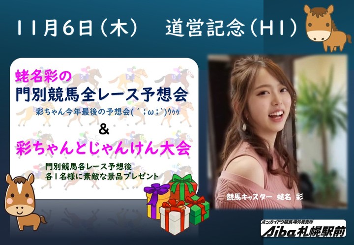 Aiba札幌駅前イベントについて(11月6日)Aiba札幌駅前では、11月6日(木)に競馬キャスター蛯名彩さんによる門別競馬場全レース予想会&じゃんけん大会を行います